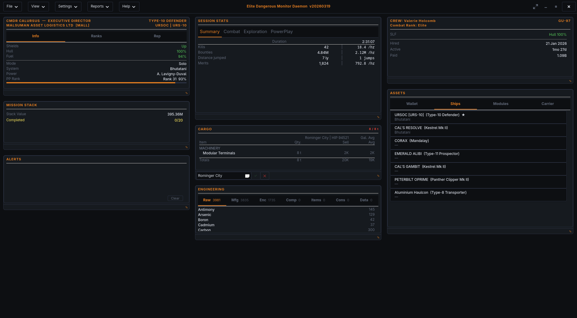 EDMD tracks activity across all major playstyles — combat, exploration, exobiology, mining, trade, missions, and powerplay — displaying live statistics in a tabbed GUI and emitting 15-minute summaries to terminal and Discord. It monitors NPC crew, SLF status, engineering materials, cargo pricing via Spansh, and assets at risk (bounties, bonds, unsold cartography and exobiology data).